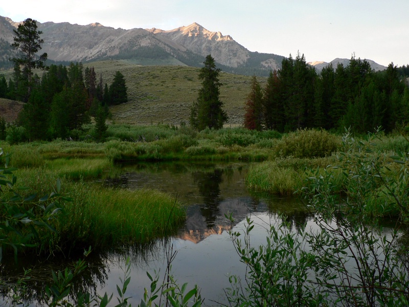 | Boulder Peak from near camp reflecting in a beaver pond in the evening. |