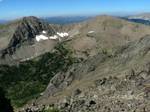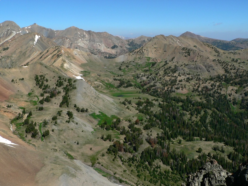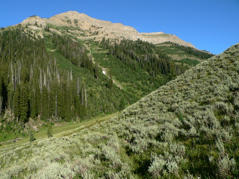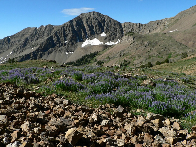 The drive to the trailhead was effortless. The road was blocked off sooner than expected, but only by 1/4 of a mile or so. I knew there was a way to hit 4 or 5 10000' peaks on this trip, but with time contraints, I immediately quashed those thoughts when I headed up the West Fork Trail Creek trail. After following the trail to around 8000', I lost it from time to time between 8000' and 9000'. By 9000' I just gave up and made my way toward the basin below the 10000' saddle that seperated the branches of Trail Creek. This basin was gorgeous and I eventually could see the trail coming down from the saddle (it disappeared into the basin).