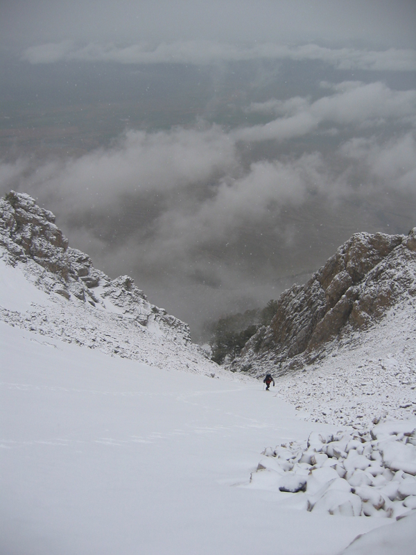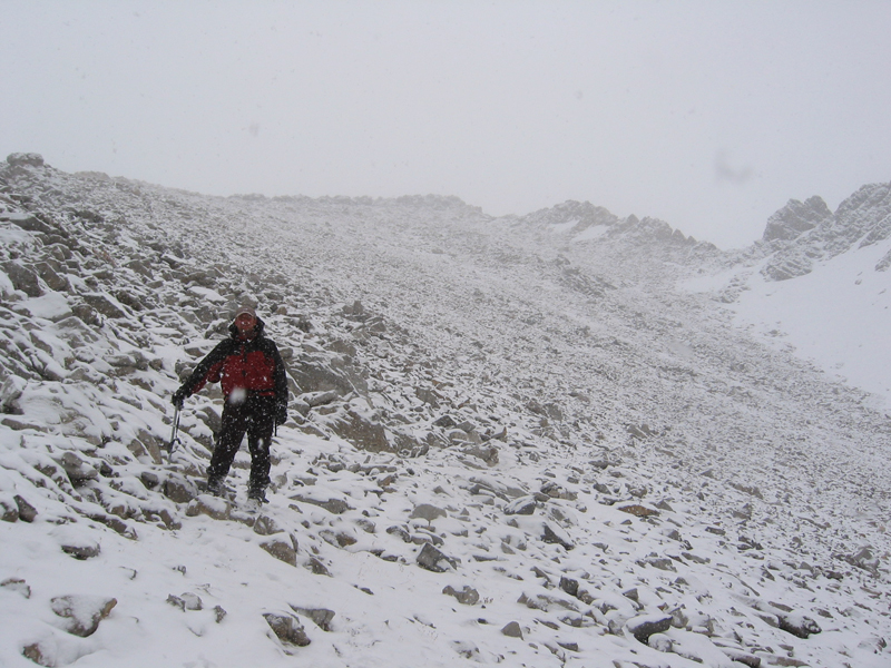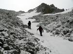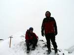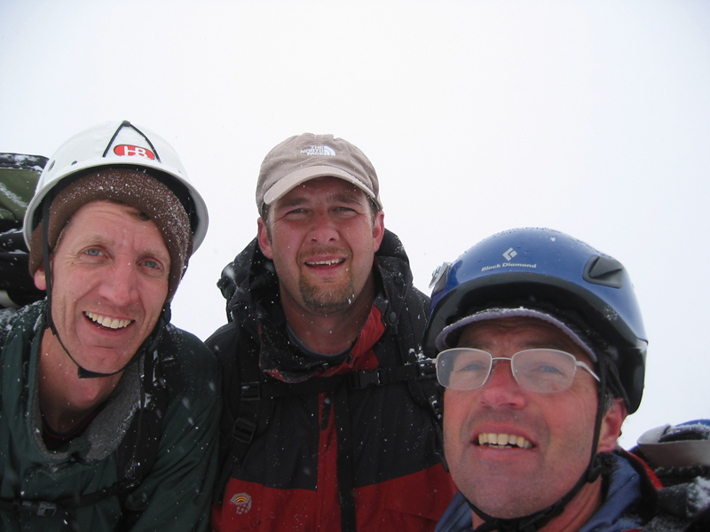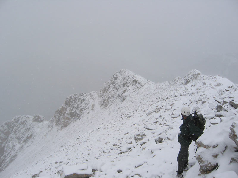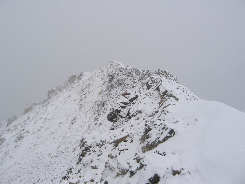 Just past the top of the 1st gully, the ridge was a definate challenge. We worked our way back and forth on the ridge, trying to minimize exposure while making a lot of tough moves on the narrow, exposed, and freshly snow covered ridge. With the falling snow and wind, it was like a scene out of a mountaineering movie and a blast. Just before the summit, the ridge eased up and we put back on our crampons for the final snow slope. It seemed to snow hardest while we were on top and the wind picked up. So after some quick photos, we hurried down the slope. On this section, Richard did some awesome route finding just below the ridge on the west side. It was still tricky footing, but it saved us a lot of time and exposure from what we did on the ascent.
