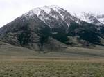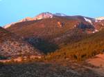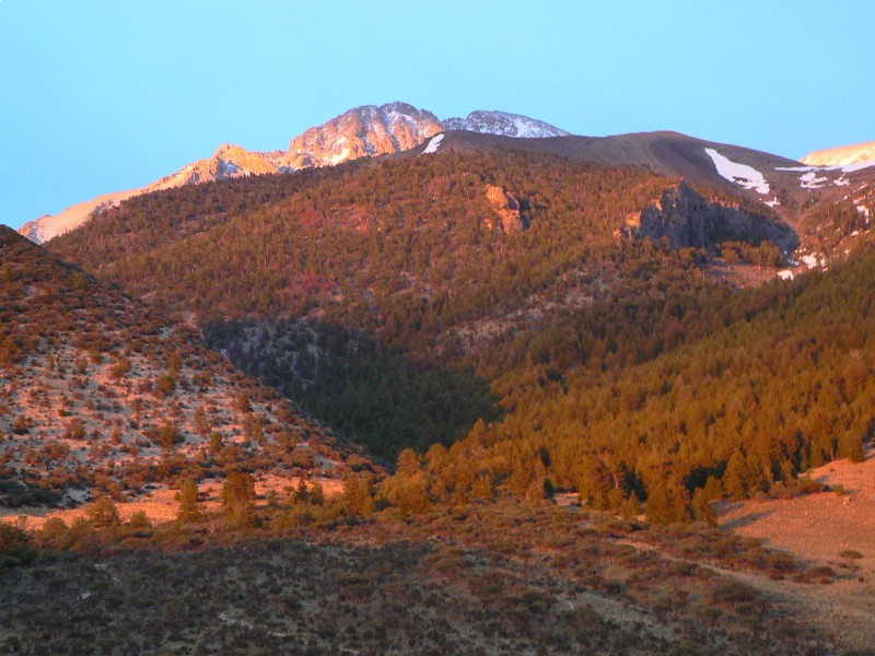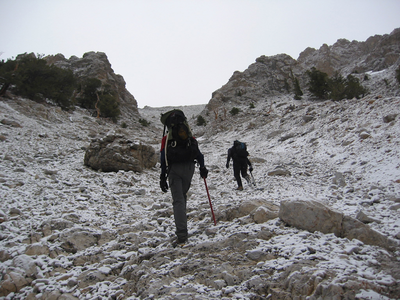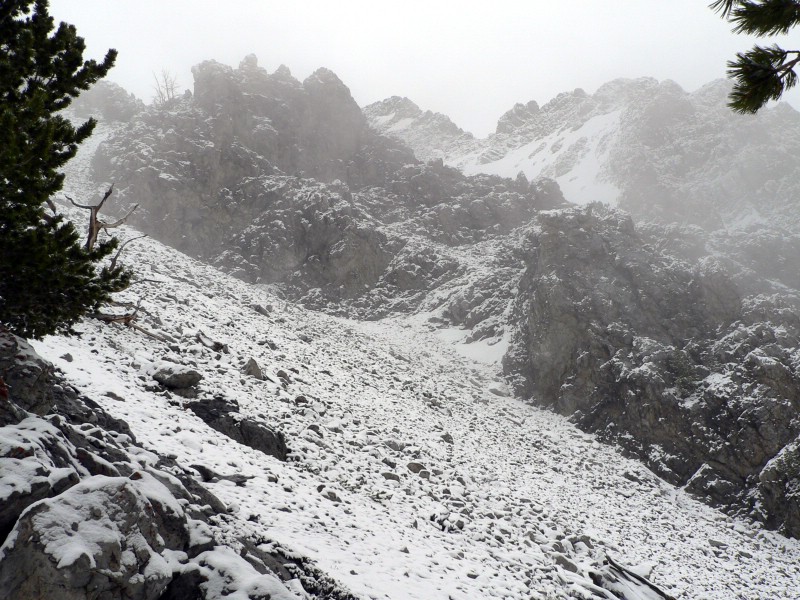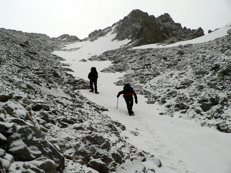 The inital part of the gully was steep and loose. As the gully narrowed down, the rock was a bit more solid, which was good beings that there was a fresh coating of new snow making things slick. When we got through the narrowest section, the gully had a more northerly aspect and contained good, hard snow. We put on crampons at this point. I had purchased new boots and step-in crampons. That combo worked very well on Mount McCaleb. However I had to return the boots because they had prior damage and the new order had not come yet. Still wanting to use the crampons, I tried the step-ins with my old La Sportiva Glaciers. It worked like a charm in my living room, despite no front toe rand on the Glaciers. However, about 100 feet up the snow field, my left crampon came loose. I adjusted and fiddled, but could not get them to stay secure (hmmm... my home must not have caused the pressure the slope did). I did my best and finished out the snow climb that got fairly steep before ending a couple of hundred feet below the north ridge. We then scrambled up onto the ridge and I was reunited with a place I had been in January of last year. I commented to Richard that my last trip up this peak ended here, as did his. Both of us couldn't get past this point (10600') before due to bad snow... not much had changed for this round.