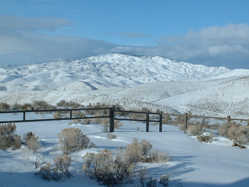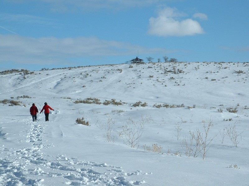 I then noticed the area across from Lucky Peak dam had some snow covered roads, so I drove across the damn and parked in Lydel Gulch. Just after the road was blocked off with trees and rocks, I took the fork heading right and up a steep ridge. This led to the a flat area where the Oregon Trail remnants are located. I noticed a small hill with a building on it and assumed it was Bonneville Point and made that my goal for the hike. Surprisingly, the views from the top were pretty good. See the photos below.