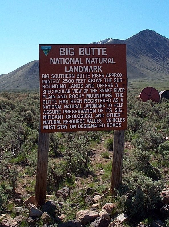 Sign about Big Southern Butte with the butte in view behind.