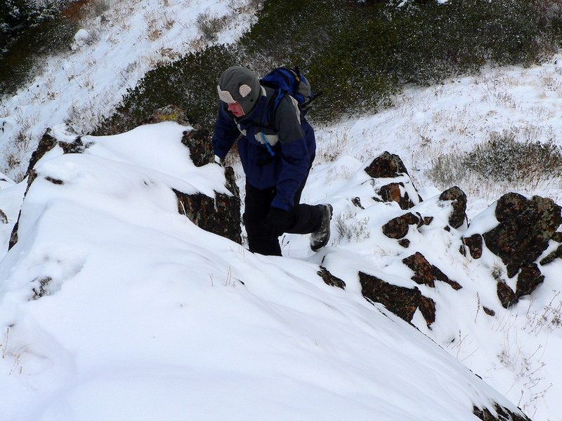 Zach ascending snow-covered rock. |