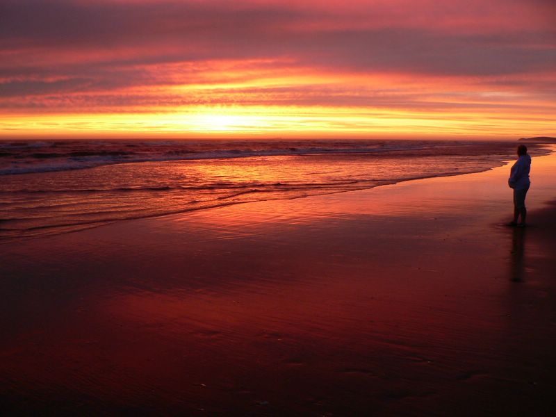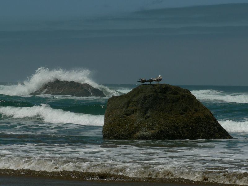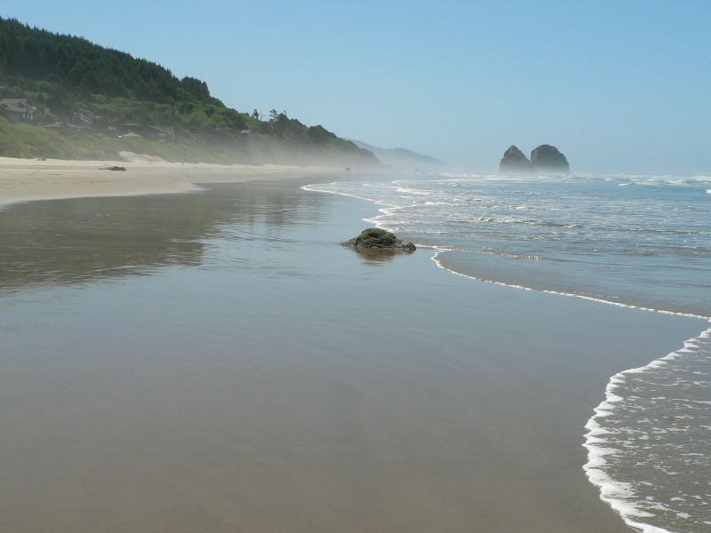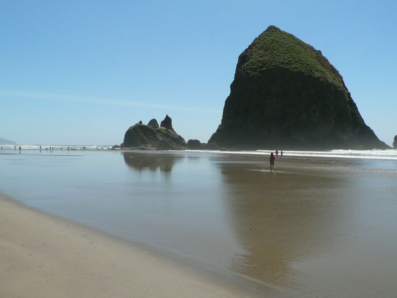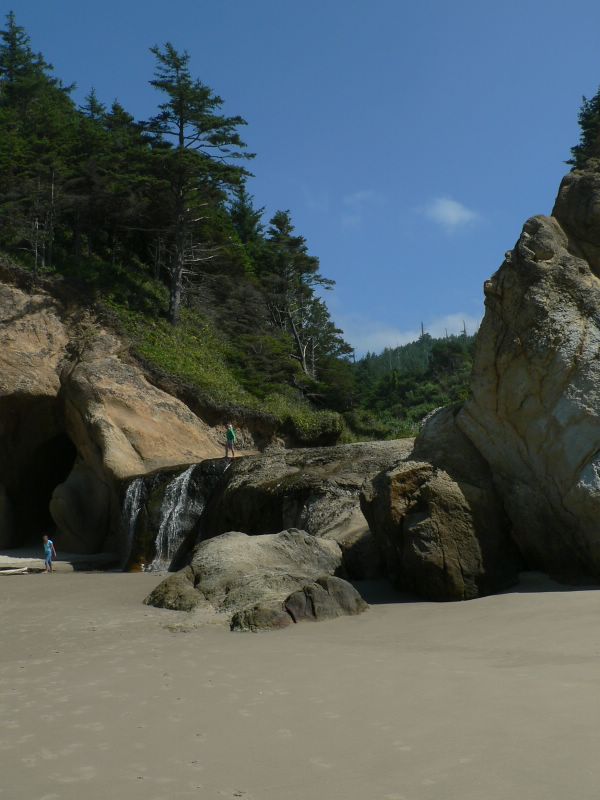 On Day 4 we drove from Nehalem Bay north to Cannon Beach. Along the way, we found the really neat recreation site of Hug Point, where we ran around cliffs when the waves went out to access several secluded areas nearby. In Cannon Beach we shopped and walked the beach, visiting Haystack Rock on 2 occassions. Haystack Rock is the 3rd highest "sea stack" in the world.